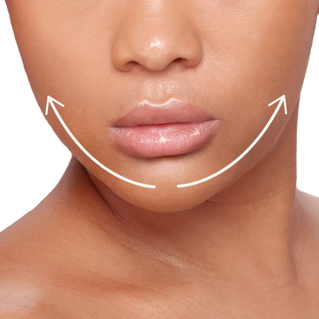 Beginning at the center of the chin, glide the gua sha tool’s ridge in an upward and outward motion toward the ear following the jawline. As you reach just below the ear, press firmly into the skin with a wiggle motion.
