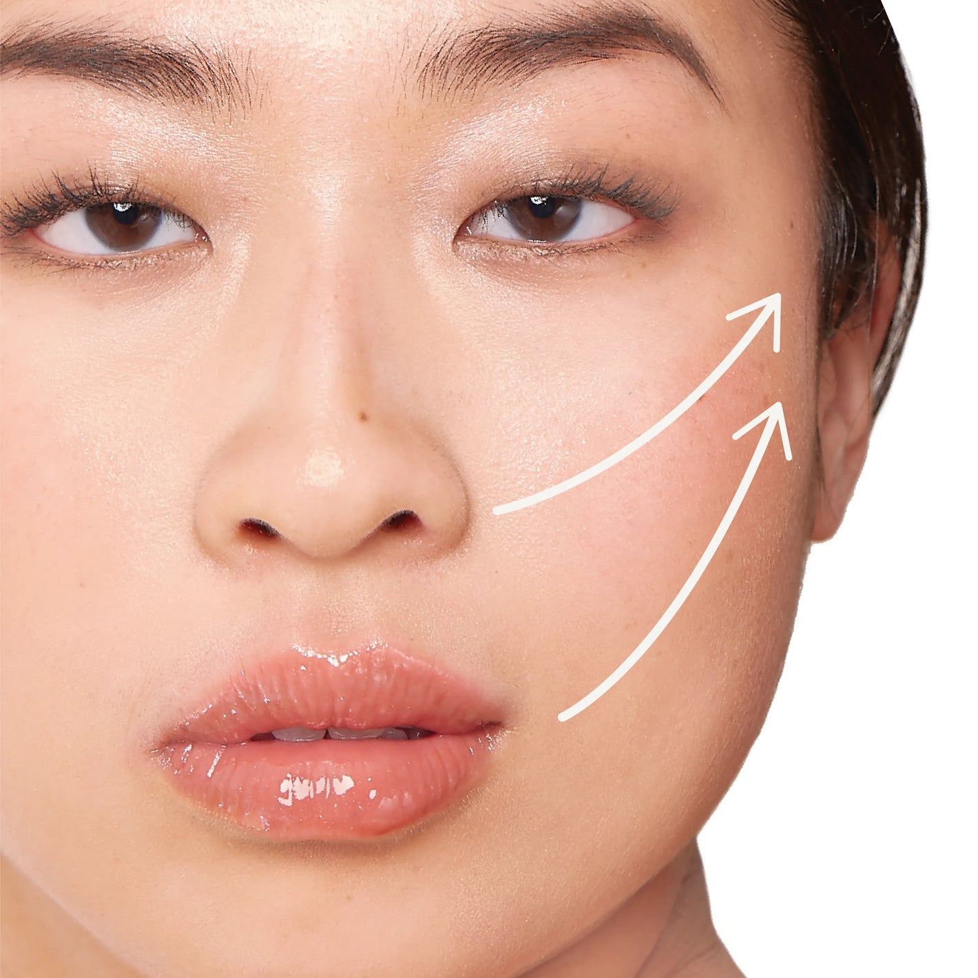 Using the long edge of the gua sha tool, begin at the nose and work upward and outward following the cheek bone structure towards the hairline.