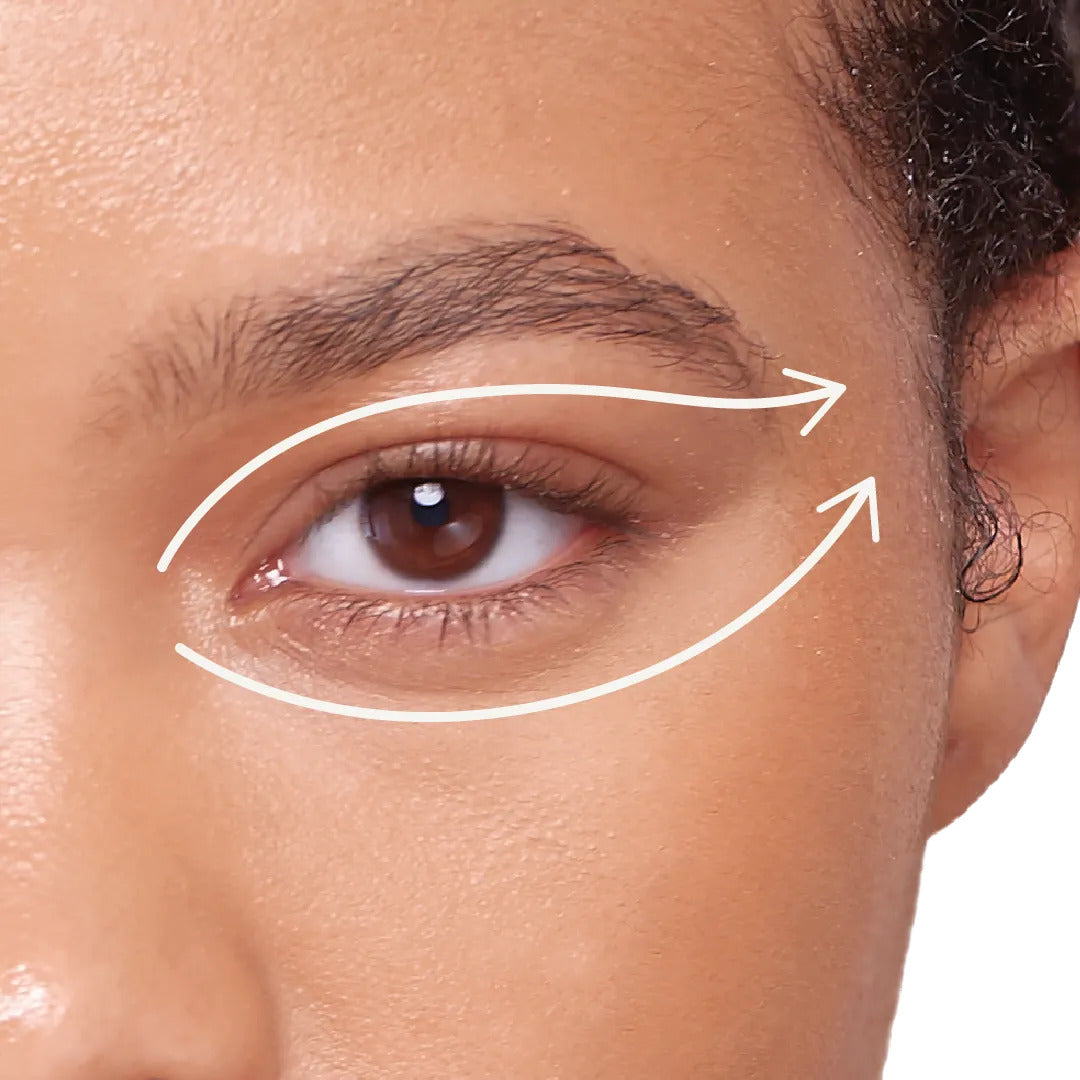 Using the pointed edge of the tool, begin in the inner corner of the eye and swoop outwards toward the temple and hairline. Be very gentle in this area.