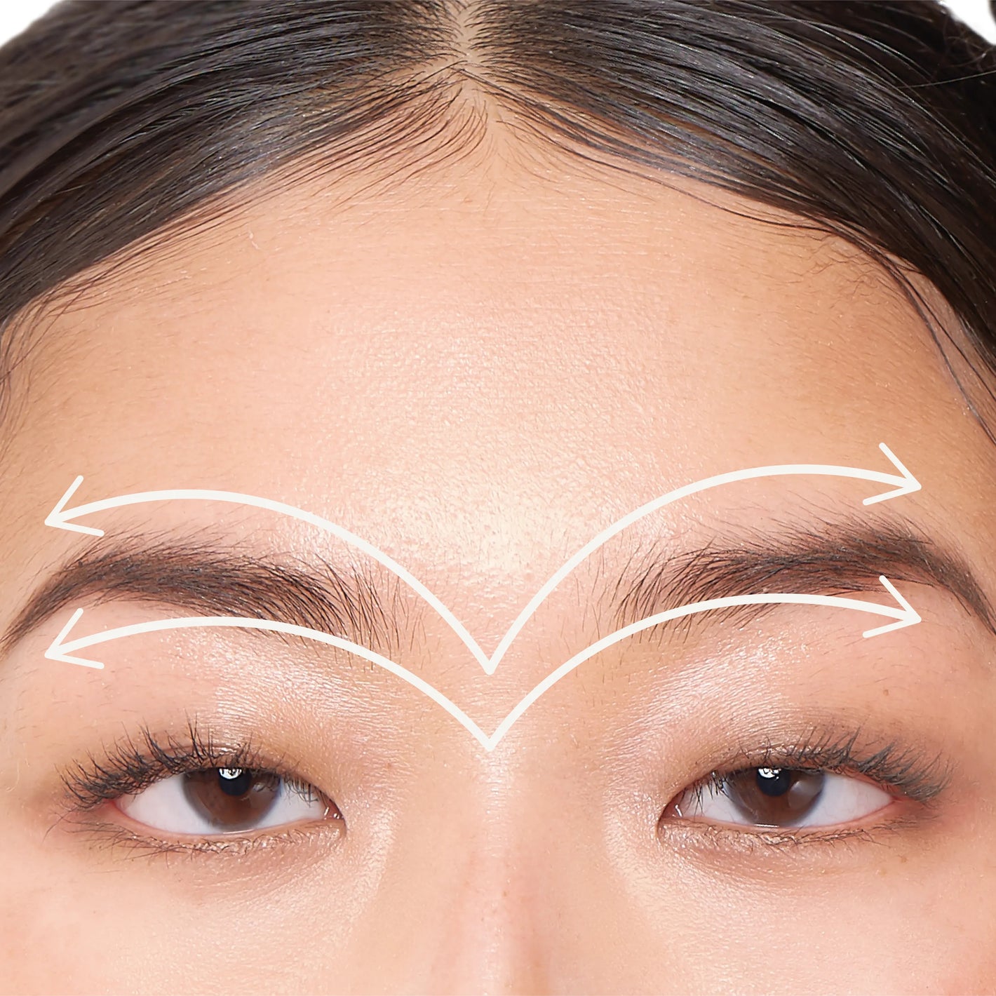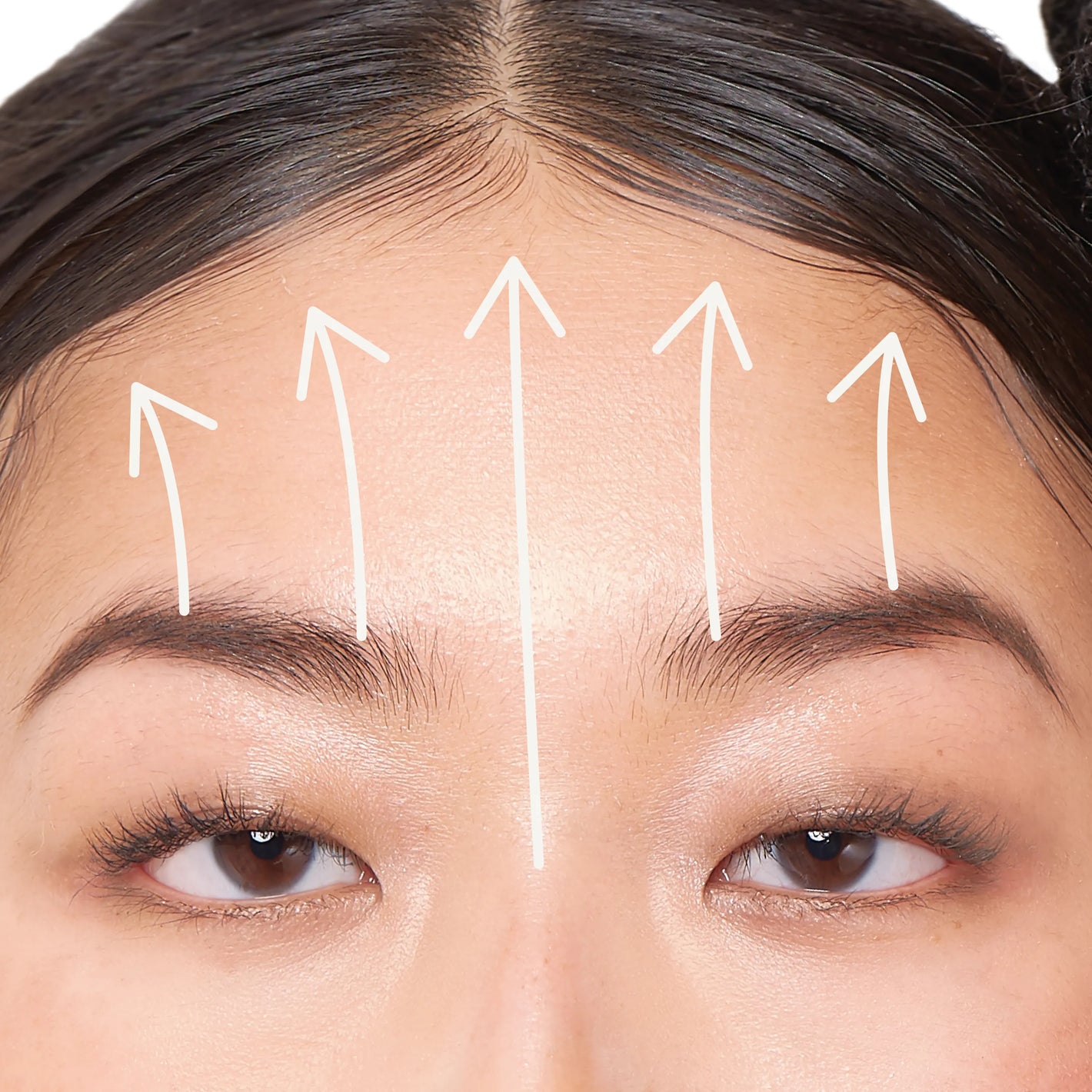 Beginning above the brow, use the long edge of the tool and work upward, pressing firmly until you reach the hairline. Repeat this process above the other brow, and then on the space between.