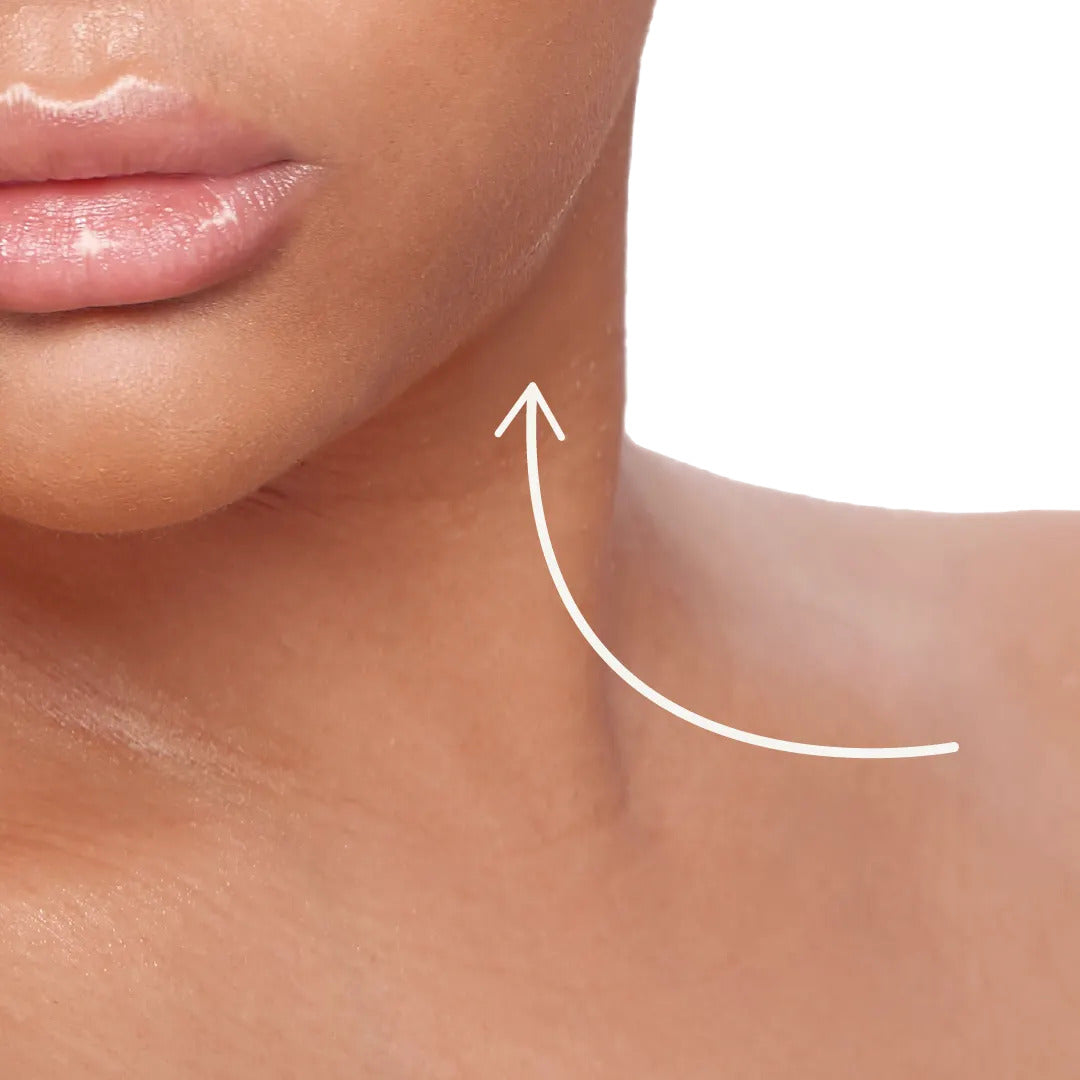 Using the ridge edge of the gua sha, begin at the collarbone and work upwards until you reach the jawline. Repeat this process until you reach the opposing side. When using the gua sha over your throat, be gentle.